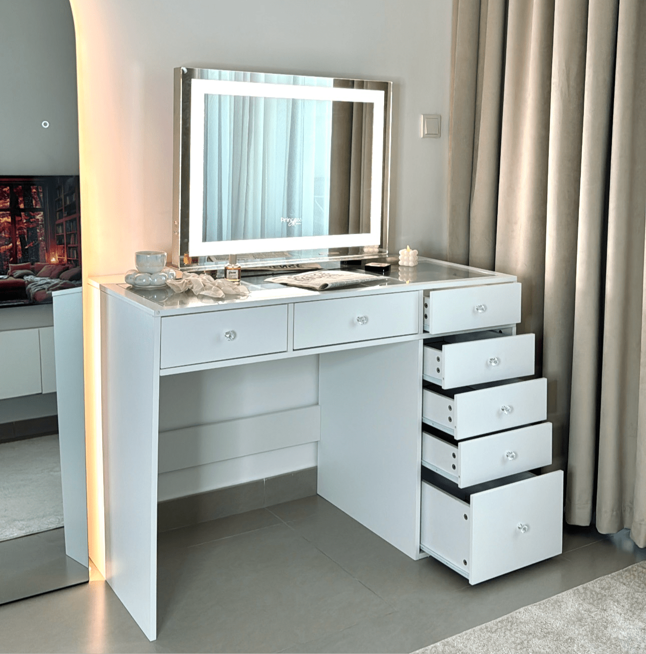 Les tiroirs intégrés permettent d’organiser maquillage, pinceaux, bijoux et accessoires du quotidien de manière efficace et élégante.